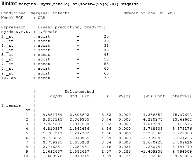 Informasi tabel analisanya menunjukan nilai write pada berbagai nilai socst, contoh nilai write male pada socst=25 adalah 33.38182, sedangkan untuk write female adalah 43.26361. Perbedaan antara male dan female 43.26361 – 33.38182 = 9.88179. Untuk melihat perbedaan nilai write pada beberapa nilai socst antara male dan female dapat juga digunakan perintah margin dengan menulis perintah dydx pada option.